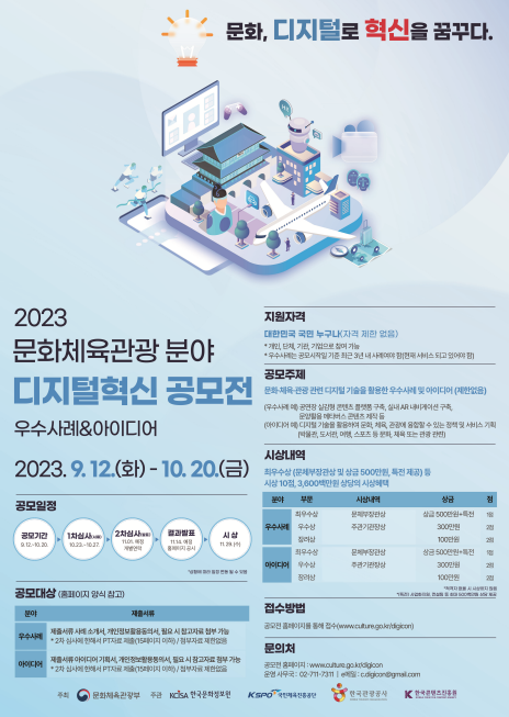문화체육관광부(장관 박보균, 이하 문체부)와 한국문화정보원(원장 홍희경, 이하 문정원)은 정부의 디지털 전략과 문화정책에 부응하기 위해 ‘2023 문화체육관광 분야 디지털혁신 우수사례&아이디어 공모전’을 통해 다양한 우수사례와 아이디어를 9월 12일(화)부터 10월 20일(금)까지 모집한다.